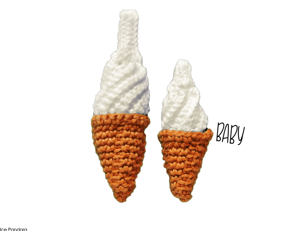 Stuffed handmade crochet (not knitted!) soft serve ice cream pins made with 100% mercerized cotton.